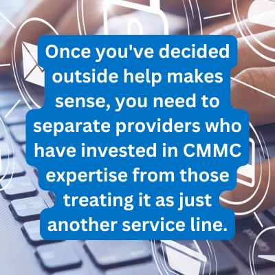 Once you’ve decided outside help makes sense, you need to separate providers who have invested in CMMC expertise from those treating it as just another service line.